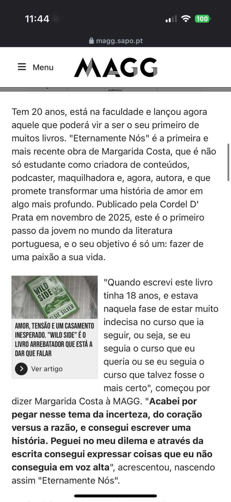 Fui entrevistada pela MAGG, uma plataforma digital dedicada a conteúdos de atualidade, cultura e lifestyle. Durante a conversa, tive a oportunidade de partilhar o meu percurso enquanto autora, falar sobre o processo criativo e refletir sobre a experiência de publicar um livro numa fase tão jovem da vida.